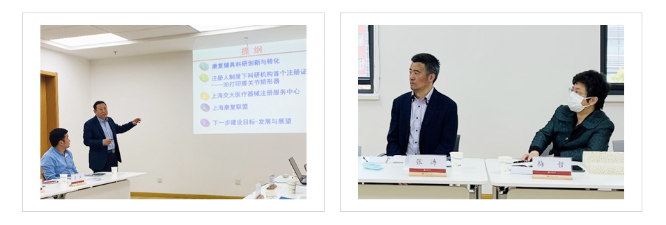 上海市民政局副局长梅哲,上海市民政局残疾人福利处一级主任科员张涛,上海交通大学转化医学研究院书记张显明,上海交通大学医学院附属第九人民医院骨科主任医师、转化医学国家重大科技基础设施(上海)创新医疗器械注册研究与临床转化服务中心主任、生物医学工程学院王金武教授,上海交大知识产权管理有限公司陆平,转化医学研究院朱顺英老师,飞马旅交大科创园(上海沧马企业管理有限公司)副总经理黄颖、运营经理丁晓晨、及王金武教授团队人员参与此次会议。